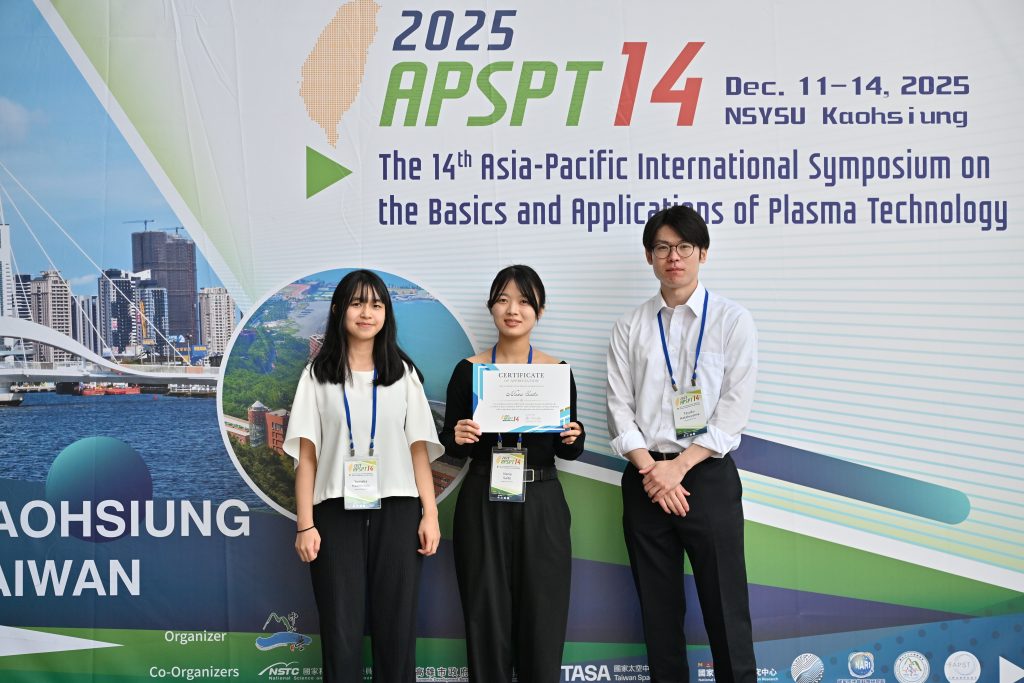 台湾・高雄にて開催されたThe 14th Asia-Pacific International Symposium on the Basics and Applications of Plasma Technology (APSPT-14)に、畠山君(M2)、橋本さん(M1)、齊藤さん(生命コース・芝研究室)が参加しました!
